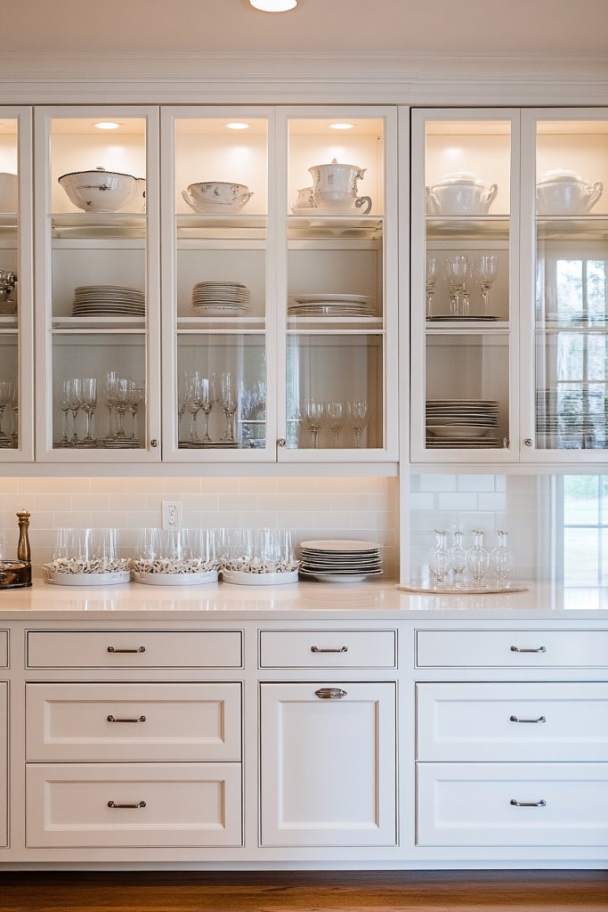 Imagine white cabinets with clear glass panels revealing neatly arranged dishes or colorful bowls. The transparency adds visual interest and depth, while the white backdrop keeps everything looking fresh and clean. The glass reflects light, enhancing the brightness of the space, and allows you to showcase your curated collection. Accentuate with sleek hardware and soft lighting inside the cabinets for a gallery-like effect.