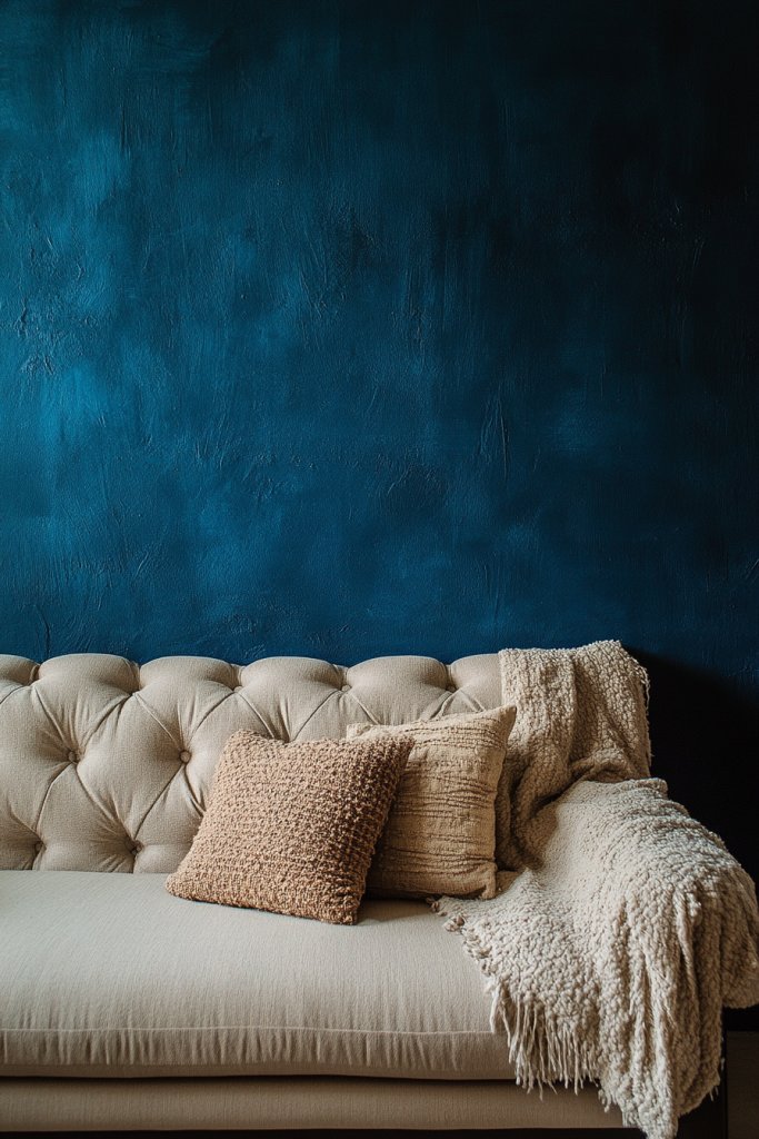 Paint the wall with a high-quality matte or eggshell finish in peacock blue. Prepare and prime the surface to ensure smooth, even color. Keep furniture simple and in neutral tones to allow the wall to be the focal point. Use soft lighting to highlight the contrast and create a welcoming atmosphere. Avoid overly busy accessories that distract from the color backdrop.