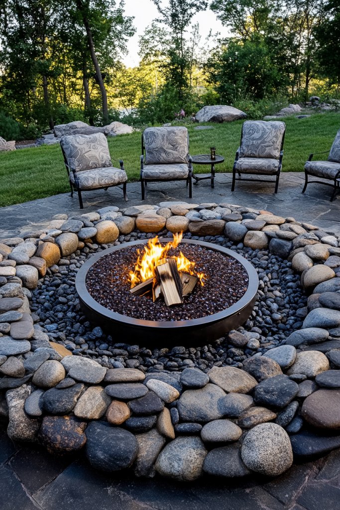 Imagine a circular fire pit surrounded by a ring of smooth river stones, varying in shades of gray and brown. The stones are carefully stacked, creating a sturdy, natural-looking barrier. Inside, a metal bowl or fire pit sits ready for crackling logs. Comfortable seating, like stone benches or rustic chairs, completes the scene, inviting friends to gather.