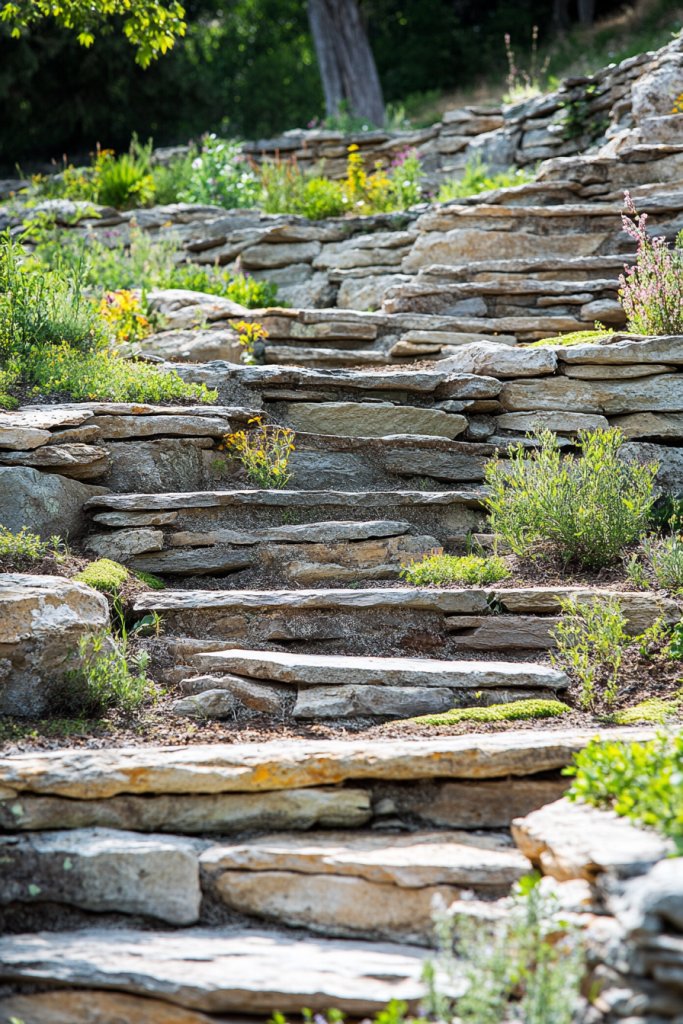 Want to add dimension and interest to a flat yard? A multi-level rock terrace creates visual layers, making your landscape feel more dynamic and inviting. It’s perfect for hillside gardens or creating separate zones for lounging and planting. Plus, it’s a great way to showcase your creativity.