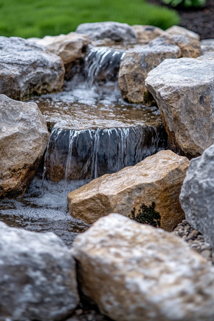 Envision a small pond or fountain with a natural, uneven base made of river stones. Water gently cascades over the stones, creating a soothing, rhythmic sound. Surrounding the feature are larger rocks and boulders, blending seamlessly into the landscape. The combination of water, stones, and subtle plantings creates a harmonious, organic look.