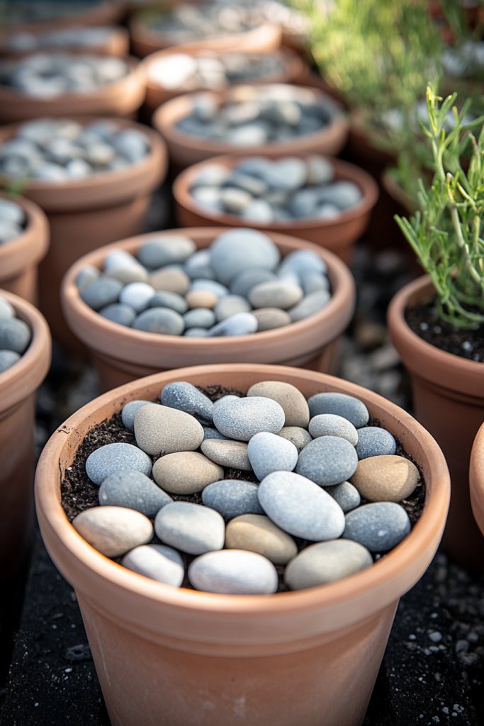 Use different sizes or colors of stones for a decorative effect. Layer stones in a pattern or keep them mixed for a natural look. For larger containers, add a mesh screen to prevent soil from slipping into the stones. Adjust the depth of the stones based on plant needs or container size.