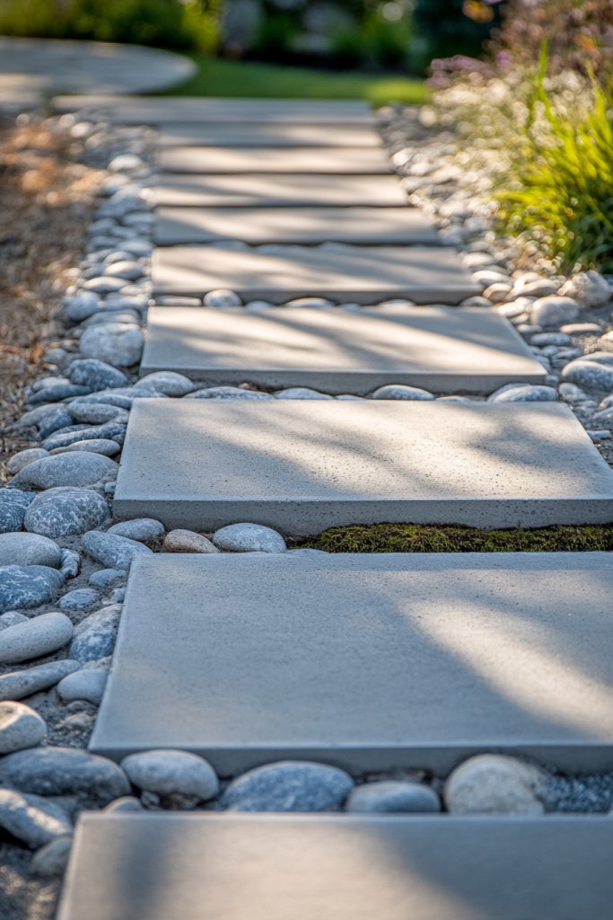 Want stepping stones that look natural and blend seamlessly into your landscape? River rock accents can elevate simple concrete slabs into artful pathways. It’s a smart way to add texture and visual interest while keeping your garden walking-friendly. Plus, it’s a project you can tackle in a weekend.