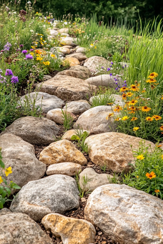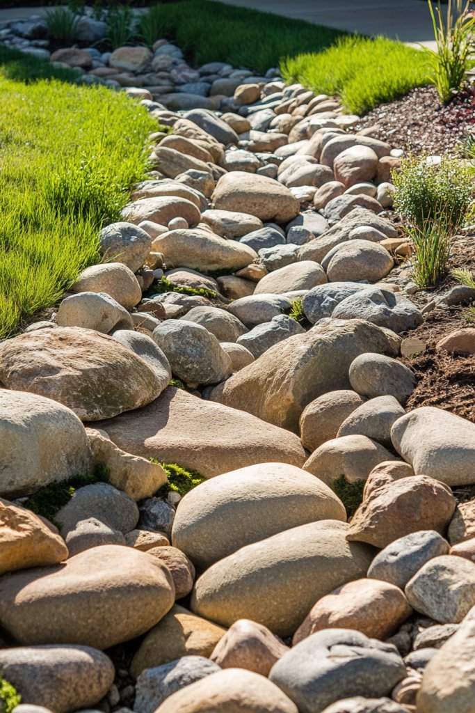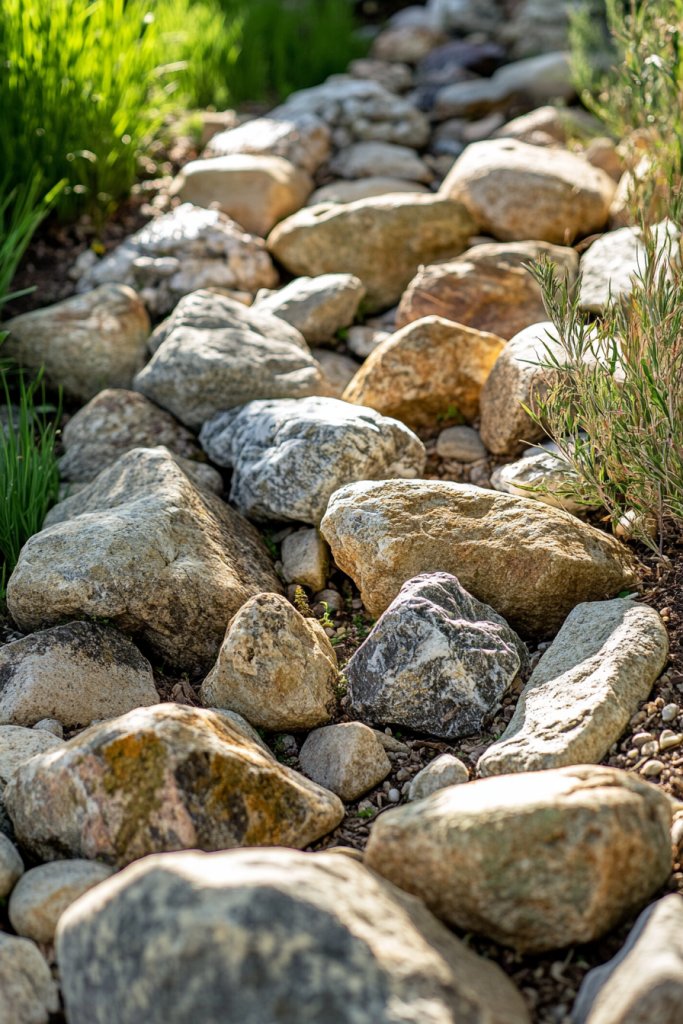 Imagine a meandering line of river stones flowing through your yard, edged with grasses and wildflowers. The stones range from small gravel to larger boulders, creating a layered, textured appearance. During rain, water flows over the dry bed, creating a mini river effect. In dry seasons, it’s a striking feature that adds depth and movement.