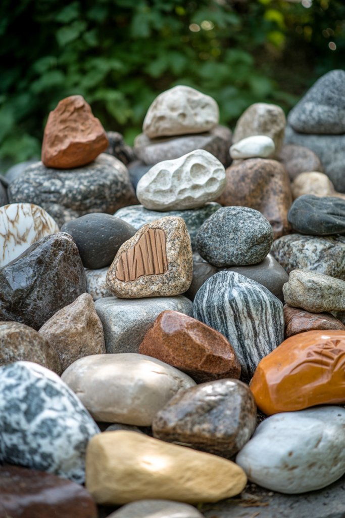Picture polished river stones integrated into sculptures, borders, or decorative features. Some stones are carved or painted, forming unique shapes or symbols. Others are embedded into concrete to create murals or textured panels. The variety of colors and textures makes each piece stand out, giving your yard a bespoke, artistic touch.