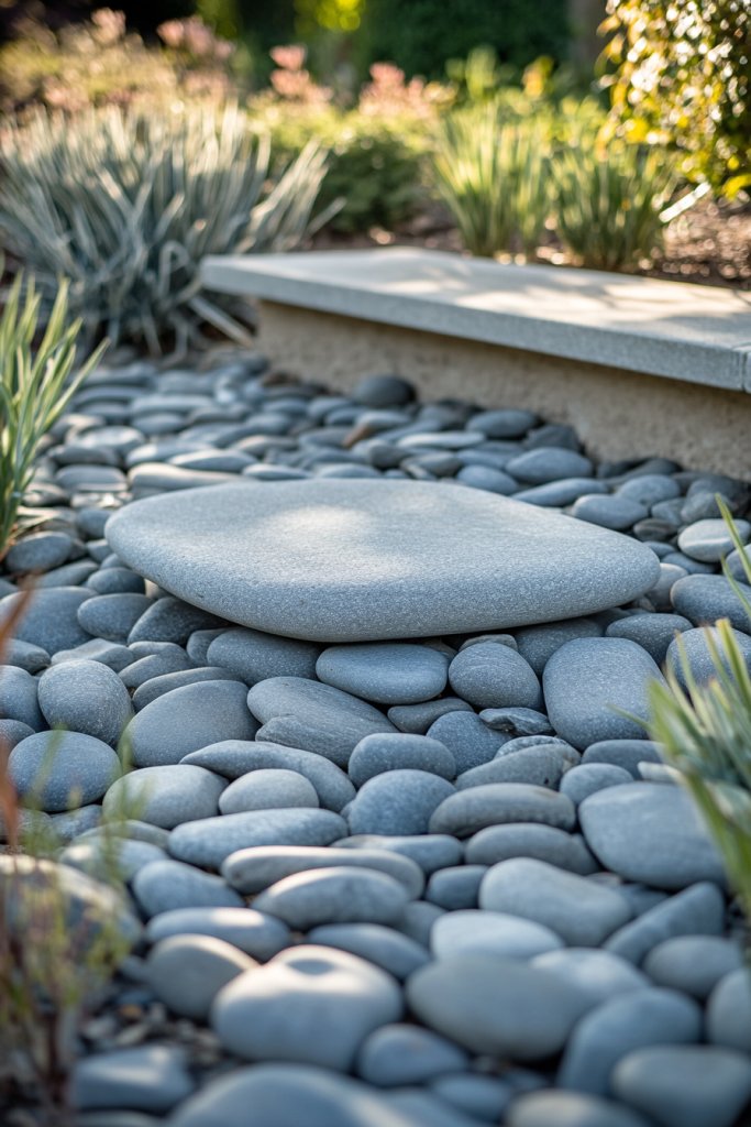Picture a bed of smooth, rounded river stones covering the base of trees and shrubs. The stones reflect sunlight in shades of gray, brown, and cream, creating a natural, textured surface. Around the plants, the rocks form a clean, crisp border that contrasts with the green foliage. It’s a minimalist masterpiece that stays fresh year-round, no matter the weather.