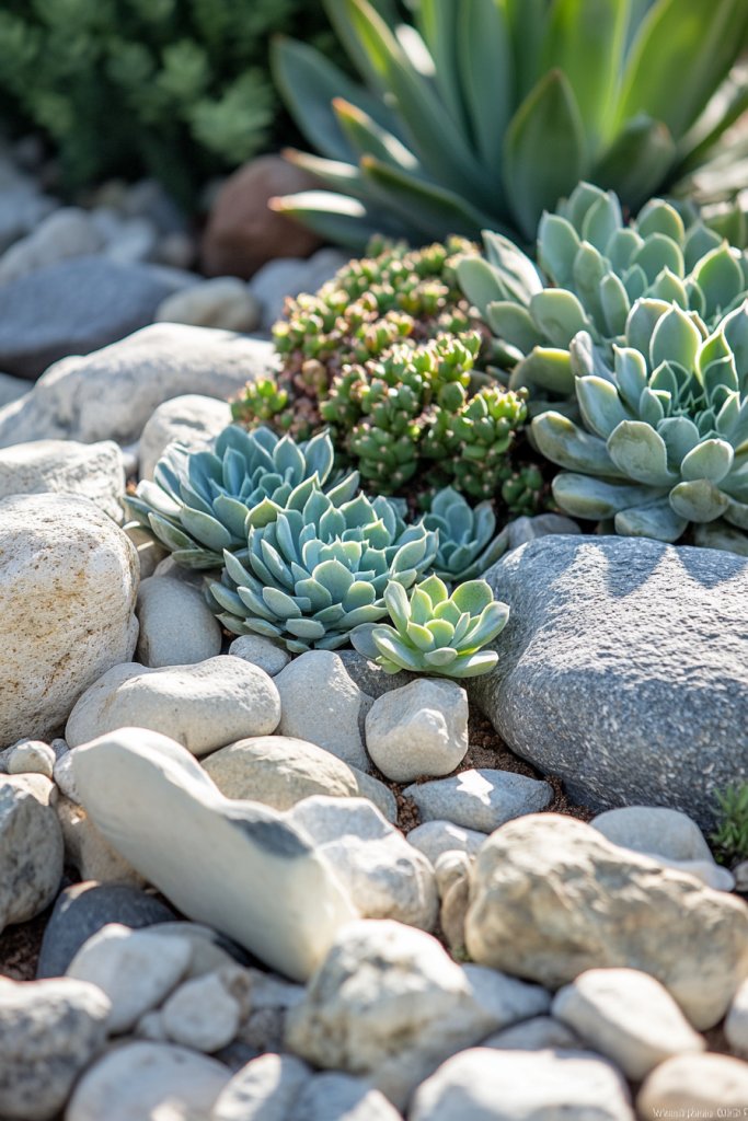 Visualize a bed of large river stones as a backdrop for colorful succulents and spiky cacti. The stones provide a natural, textured surface, while the plants add pops of red, purple, and green. The arrangement feels wild yet deliberate, with plants spaced to mimic natural growth. The sun reflects off the stones, creating a vibrant, lively scene.