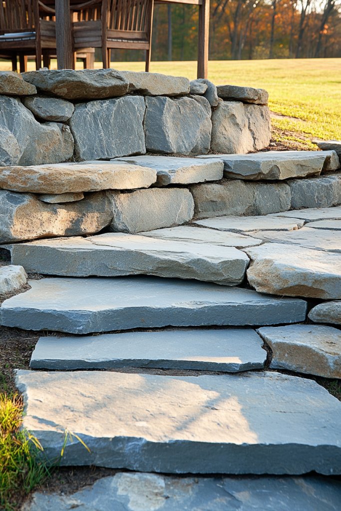 Picture a semi-circle of large river rocks stacked into a sturdy bench, nestled into a hillside or corner of your yard. The stones have rough textures and warm hues, blending into the landscape. Sitting on the rocks, you feel the cool surface beneath you, with views of the garden or sunset beyond. You’re surrounded by natural materials that invite lingering.
