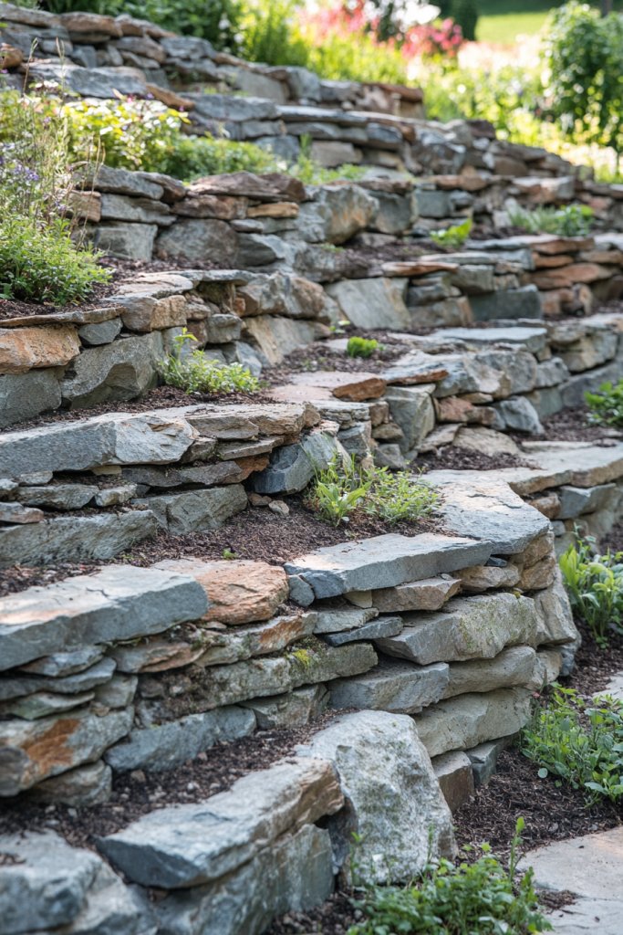 Adjust the height and number of terraces based on your space and needs. Use larger stones for the base and fill in gaps with smaller ones. Incorporate steps or pathways made from flat river stones to connect levels. Seasonal planting options or decorative gravel can add color and texture. For a more natural look, avoid perfect symmetry and embrace irregular shapes.