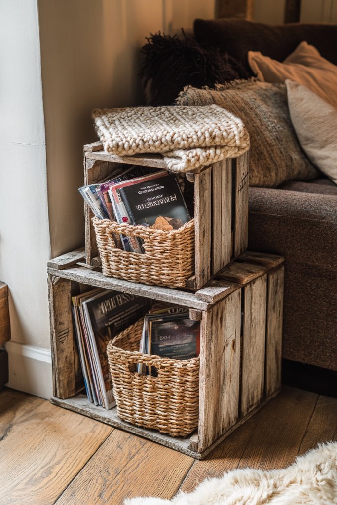 Clutter is the enemy of cozy, organized living. Repurposed crates and baskets offer a charming way to store throws, books, or magazines while adding rustic appeal. They’re versatile, functional, and perfect for small or large items alike. If your space feels chaotic, these storage solutions can help tame the mess.