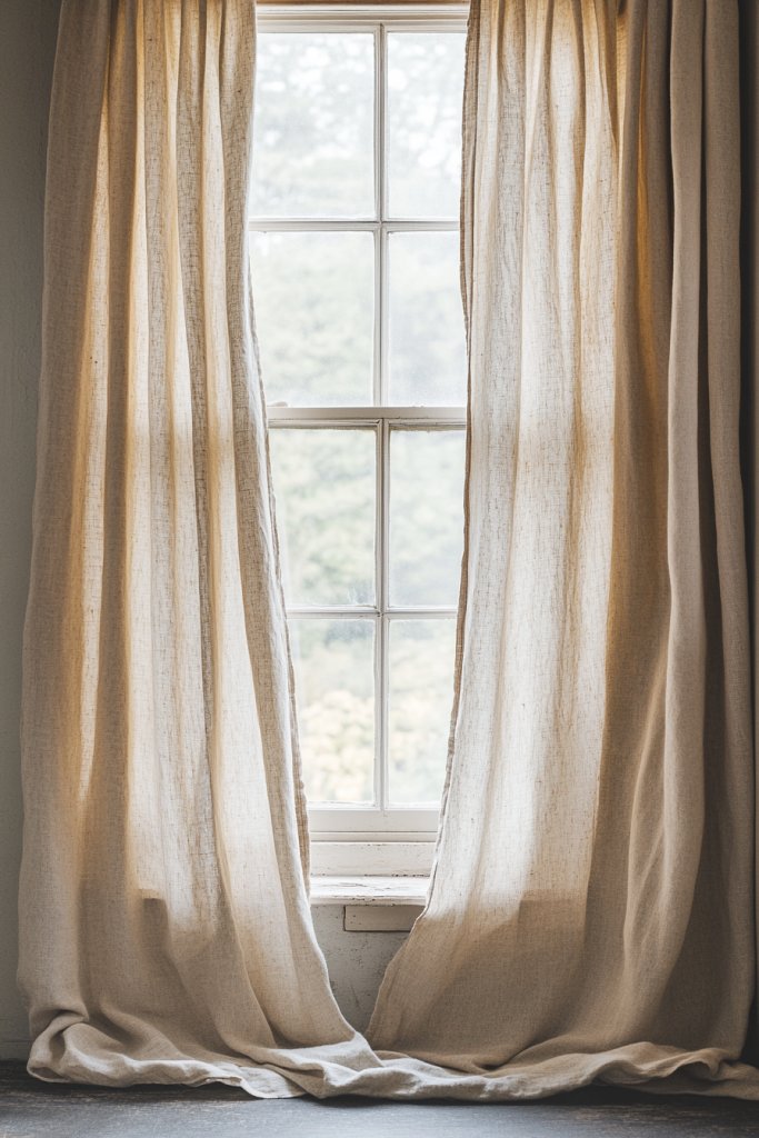 Select linen curtains in neutral tones—think creams, beiges, or light grays. Hang on vintage or distressed rods, ensuring they’re at the right height for your windows. Use simple rings or clips for easy opening and closing. Keep the fabric clean by washing according to care instructions, and consider adding tiebacks for a decorative touch.