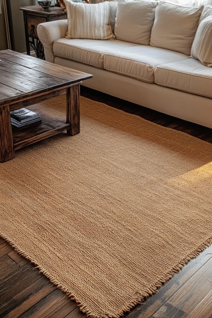 Picture a large, woven jute rug with a subtle herringbone pattern anchoring your seating arrangement. Its rough texture contrasts beautifully with soft textiles and distressed wood furniture. The earthy tones complement neutral walls and layered fabrics, creating a cozy, organic feel. The tactile quality invites barefoot strolls and adds natural depth.