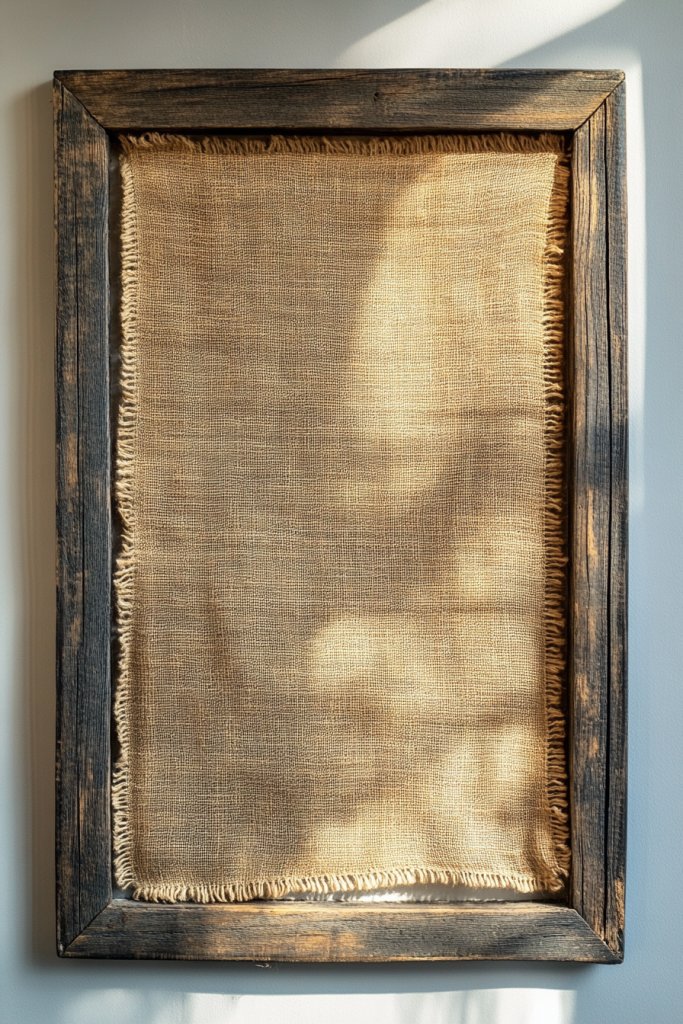 Select burlap or linen fabric in neutral or earthy tones. Mount within reclaimed wood or vintage frames—either DIY or purchased. Use simple nails, clips, or wire hooks for hanging. Keep the fabric taut and centered. Avoid direct sunlight to prevent fading. Incorporate with other rustic decor elements for a cohesive look.