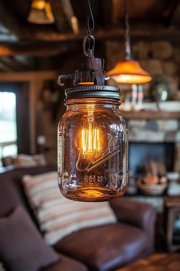 Picture a row of Mason jars hanging from vintage-style cords, each fitted with an Edison bulb. The jars diffuse warm light, casting a cozy glow over your seating or dining area. The transparent glass and simple wiring create a look that’s both nostalgic and modern. It’s a DIY project that looks professional and adds personality.