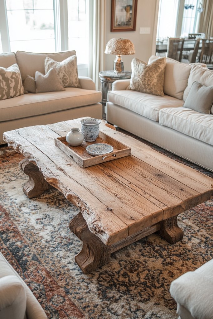 Picture a chunky, weathered table with a live edge, showing the natural contours of the wood. Its surface bears the marks of age—knots, grain variations, and subtle imperfections—that tell a story. Surround it with plush, neutral-toned sofas and layered textiles for a cozy, inviting scene. The raw texture and natural hues make it the room’s star attraction.