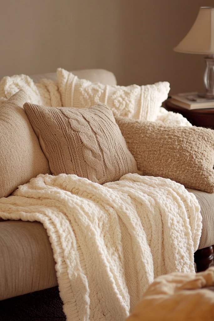Envision a plush, oversized throw in a neutral hue draped over a linen sofa. Complement it with an assortment of textured pillows—think linen, burlap, or faux fur—in earthy tones. The chunky knit pattern adds depth and tactile interest, inviting you to touch and settle in. Soft, ambient lighting enhances the inviting vibe, making the room feel like a retreat.