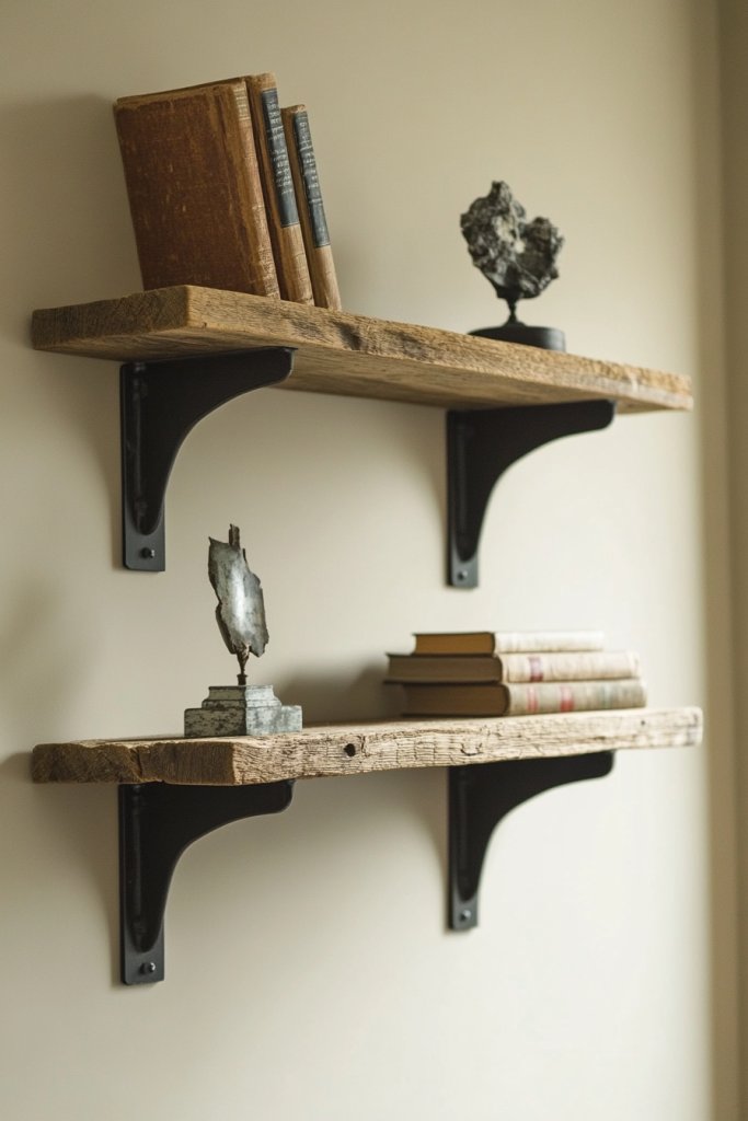 Visualize open, distressed wooden shelves mounted on a weathered brick or whitewashed wall. Metal brackets with vintage or industrial finishes support the shelves, creating a charming contrast. Decorate with vintage books, ceramic bowls, or small collectibles that echo your rustic theme. The layered arrangement adds depth and invites the eye to explore.