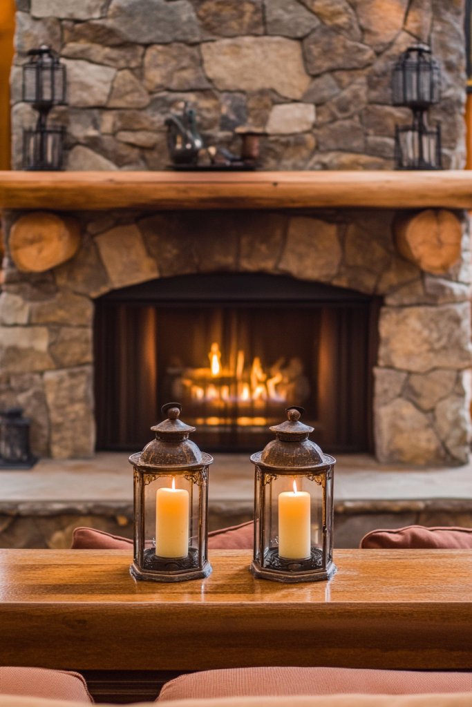 Decorate around the hearth with vintage tools, lanterns, or seasonal garlands—avoiding restricted decor. Use reclaimed wood or antique metal accents to complement the stone. Incorporate a cozy seating area nearby with textured cushions and throws. Personalize with family heirlooms or handmade crafts for a truly rustic, heartfelt vibe.