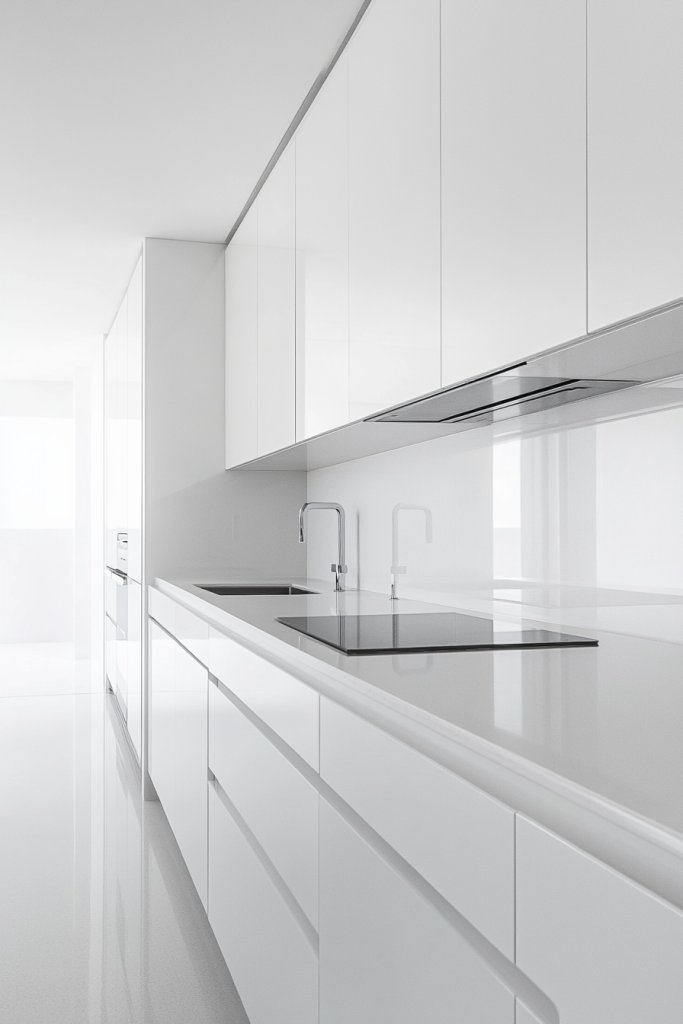 This style works well in both small apartments and spacious homes. For a warmer touch, opt for textured matte finishes or add subtle contrasting countertops. During winter months, layered textiles like wool or faux fur can add coziness. In summer, pairing white cabinetry with bright-colored accessories keeps the look fresh and lively.