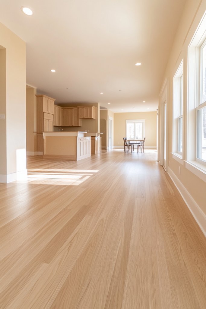 Picture a continuous stretch of pale, natural wood floors stretching from the kitchen into living areas, unbroken by walls or partitions. The flooring’s soft hue reflects natural light, making everything appear brighter and more expansive. Minimal furniture, with clean lines and neutral tones, complements the open layout. The space feels unified, calm, and ready for spontaneous gatherings or quiet mornings.