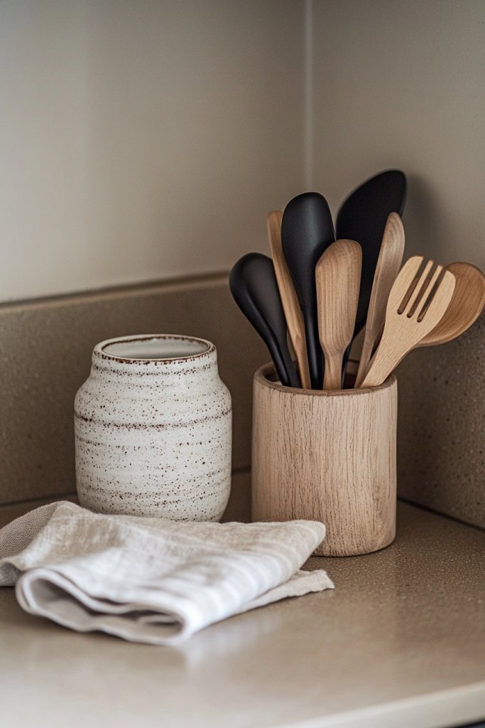 Visualize neutral-colored wooden cutting boards, stone storage jars, and bamboo utensils arranged neatly on your countertops. The textures of natural materials add tactile interest, contrasting beautifully with sleek cabinetry. These accessories blend seamlessly into your space, providing functional beauty without visual noise. The subtle earthy tones keep the atmosphere serene, elevating your kitchen’s vibe.