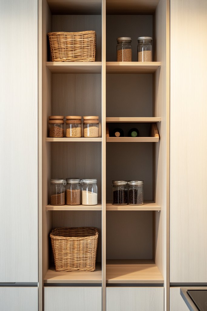 Use tall pantry cabinets with pull-out shelves or internal organizers. Wall-mounted racks or magnetic strips work well for utensils and knives, freeing up drawer space. For larger items, consider vertical dividers within cabinets. Seasonal or occasion-based accessories, like holiday-themed containers, can be stored here temporarily.