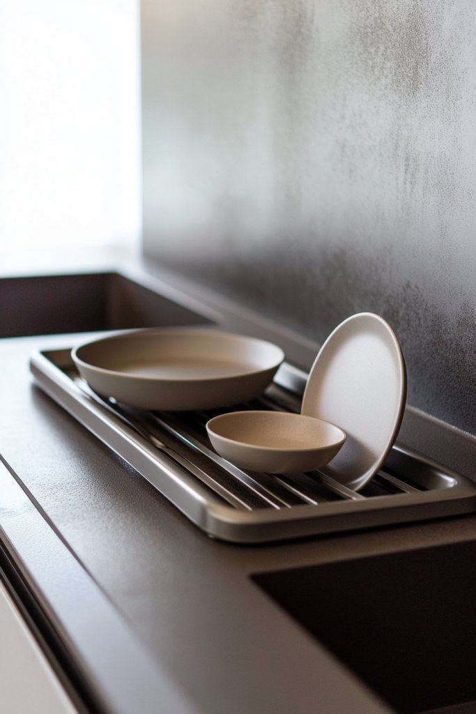 Visualize a slim stainless steel or wooden dish rack tucked neatly beside your sink, with a simple, open design. The minimalist shape complements your cabinetry and countertops, avoiding visual clutter. Dried dishes are stored upright, allowing air to circulate freely. The overall effect is a clutter-free, organized space that feels calm and inviting.