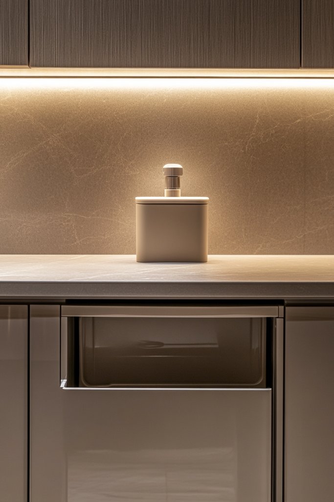 Imagine integrated cabinet drawers or pull-out compartments designed specifically for waste and recyclables. When closed, they blend seamlessly with your cabinetry, maintaining a uniform surface. The handles are flush or hidden, and the bins are easily accessible yet discreet. The overall look is clean, organized, and clutter-free, promoting a sense of calm.