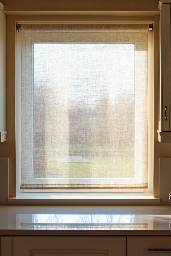 Picture sheer, neutral-toned roller blinds that filter sunlight softly into your kitchen, creating a gentle glow. Alternatively, lightweight linen curtains in natural shades hang loosely, adding movement and texture. Both options frame your windows beautifully without overwhelming the space, allowing the natural elements to shine through. The effect is a calm, serene environment with a touch of organic softness.
