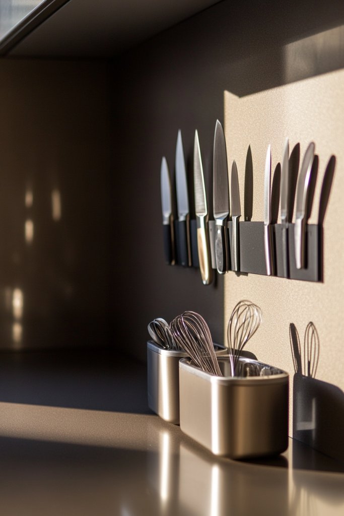 Visualize a magnetic strip mounted on a backsplash or wall, holding knives and small metal utensils in perfect alignment. Nearby, minimalist containers in matte finishes store spatulas, whisks, or wooden spoons. The arrangement is both functional and aesthetically pleasing, with everything displayed in a tidy, accessible manner. The space feels open, calm, and ready for action.