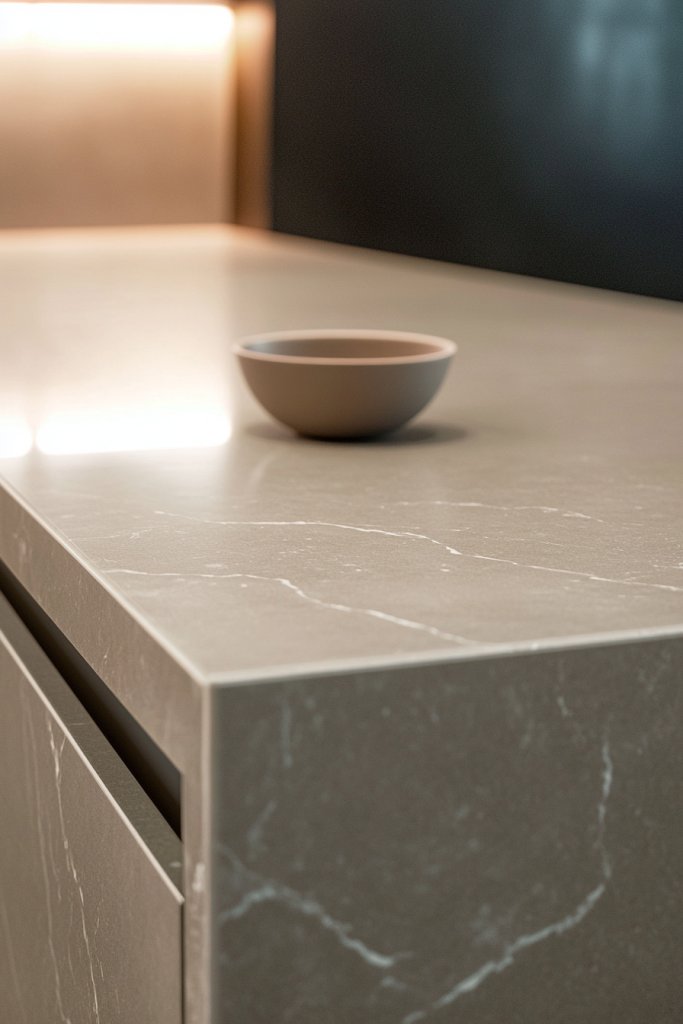 Picture a smooth, matte gray surface with barely-there edges that seamlessly blend into your cabinetry. The soft hue complements both warm and cool color schemes, creating a versatile backdrop. The minimal edges give the countertop a floating appearance, enhancing the minimalist vibe. It reflects light subtly, making the space feel brighter and more expansive.