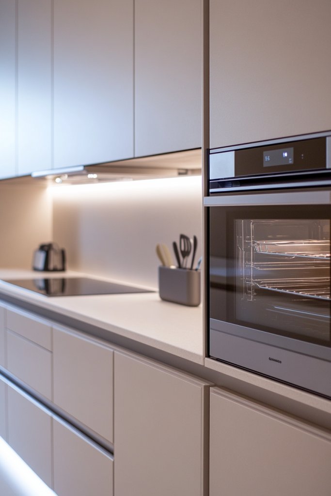 Add subtle hardware or custom panels with textured finishes to personalize the integrated units. Incorporate soft-close mechanisms for smooth operation and longevity. Use matching or contrasting handles in other areas to create visual harmony. Incorporate smart technology for energy efficiency and convenience, further elevating your kitchen’s modern appeal.