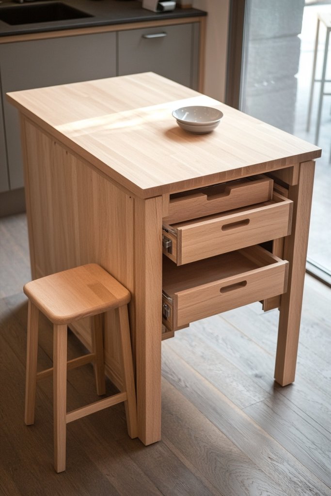 Picture a small wooden island with clean lines, tucked into a corner or center of your kitchen. Hidden drawers and shelves keep utensils and cookware out of sight but within reach. A simple wooden top provides a sturdy surface for chopping or serving, while its minimalist design complements your overall aesthetic. During gatherings, it doubles as a buffet or bar area, blending practicality with style.