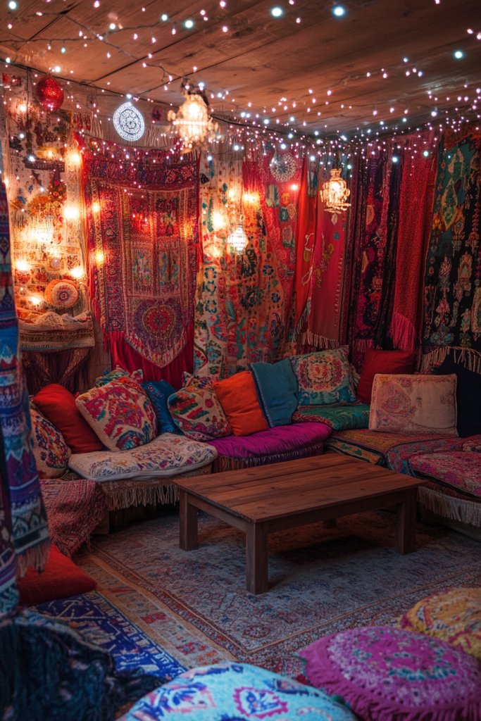 Imagine a space layered with colorful rugs in rich patterns, complemented by a collection of textured throws and plush cushions. String lights drape across the ceiling, casting a soft glow that feels magical at night. The walls are decorated with handcrafted macramé or woven wall hangings, making the space feel eclectic and inviting. Every detail invites you to sink in and relax.