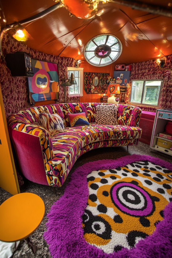 Imagine walls adorned with vibrant geometric wallpaper or bold murals. Furniture features curved lines, bright colors, and vintage finishes—think velvet armchairs or wood-panelled desks. Decor includes funky lighting fixtures, shag rugs, and playful accessories like lava lamps or record players. The overall vibe is energetic, colorful, and full of life.