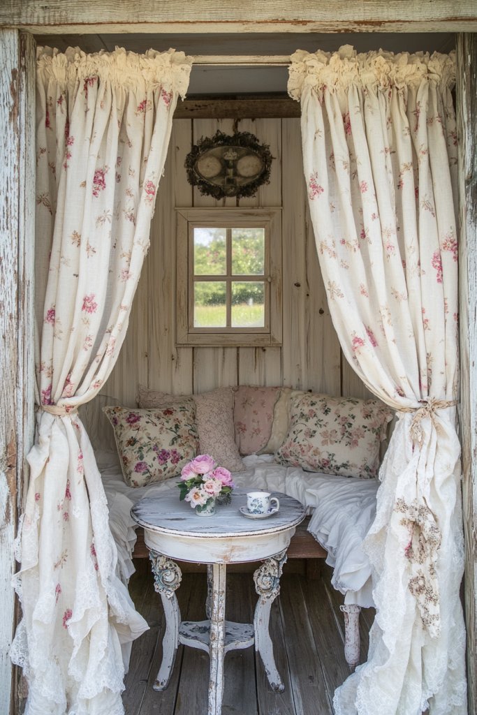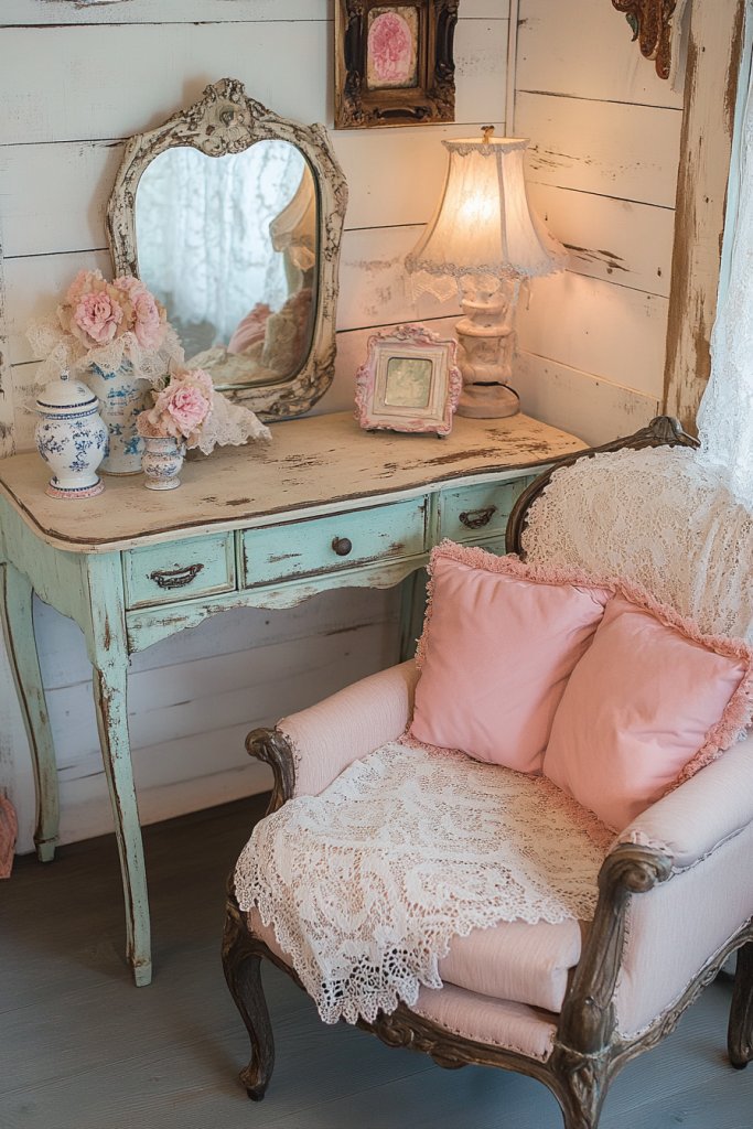 6. Feminine Shabby Chic Nook with Pastel Colors and Antique Details