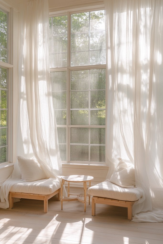 Visualize large windows with sheer, flowing curtains that diffuse sunlight softly. White or pastel furniture creates an open, spacious feel, complemented by light textiles and minimalist decor. Plants are kept to a minimum or replaced with decorative elements that don’t block light—think glass or acrylic accents. The environment feels fresh, breezy, and inviting, perfect for relaxing or working.