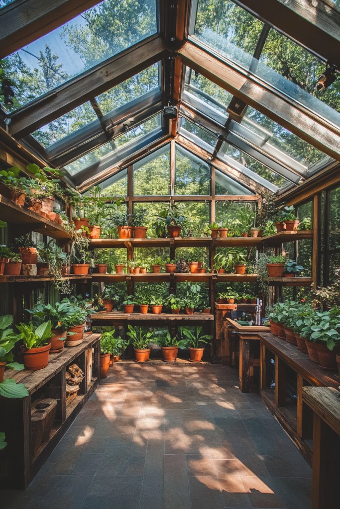 8. Eco-Friendly Greenhouse She Shed with Skylights and Plant Nooks