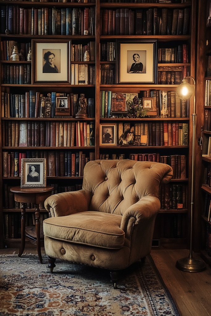 Envision a warm, inviting corner lined with vintage-style bookshelves filled with well-loved books. A plush armchair or a vintage chaise lounge beckons you to sit and unwind. Soft lighting, like a table lamp with a fabric shade, creates a warm glow. Decor includes antique trinkets, a woven throw, and a small side table for your favorite beverage. The atmosphere feels intimate, nostalgic, and inviting.