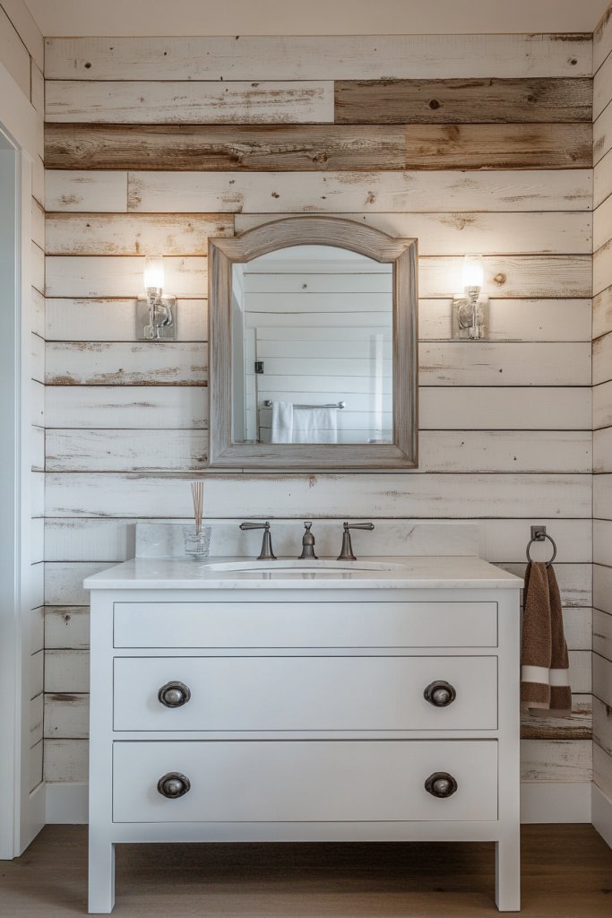 Craving a sleek, clutter-free bathroom that still retains rustic charm? Minimalist shiplap with hidden hardware delivers clean lines and a modern aesthetic. If visible nails and screws distract from your decor, this idea offers a neat, streamlined look. It’s perfect for lovers of rustic minimalism.
