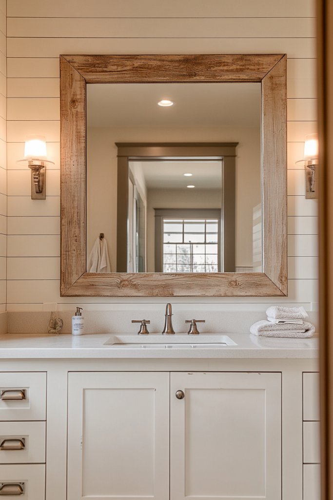 A shiplap-framed mirror instantly elevates your vanity into a rustic focal point. It’s a straightforward upgrade that offers a big style payoff. With a little effort, you can craft a bathroom space that feels both cozy and curated—proof that small details make a big impact.