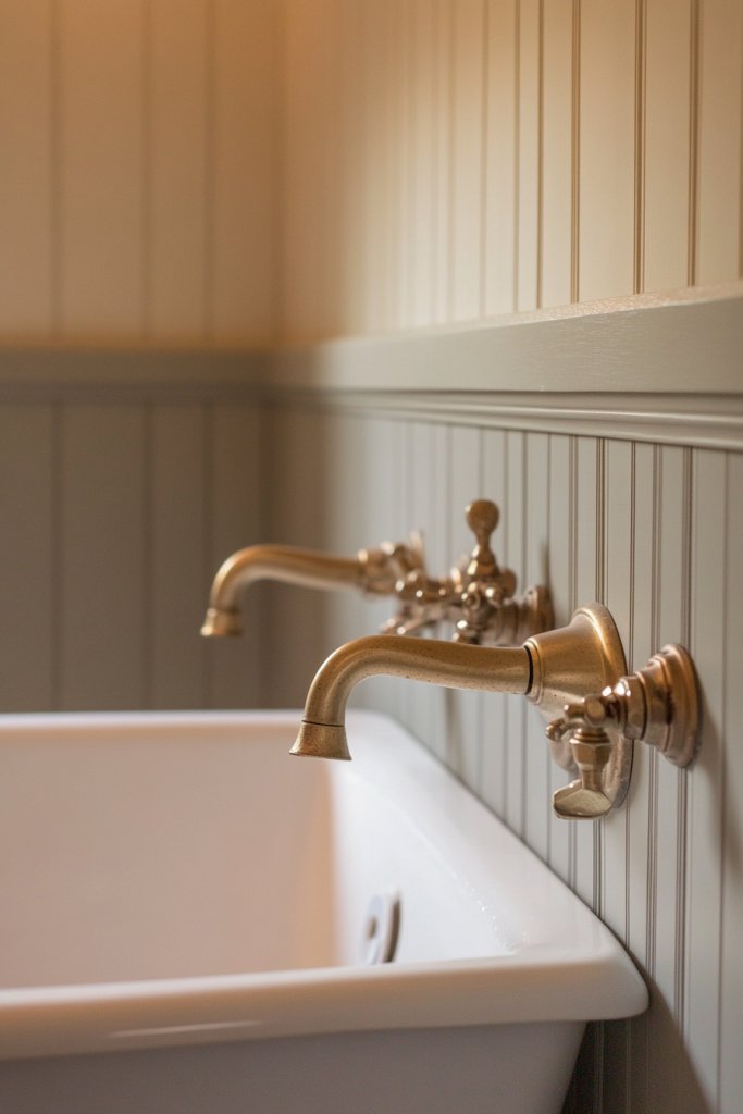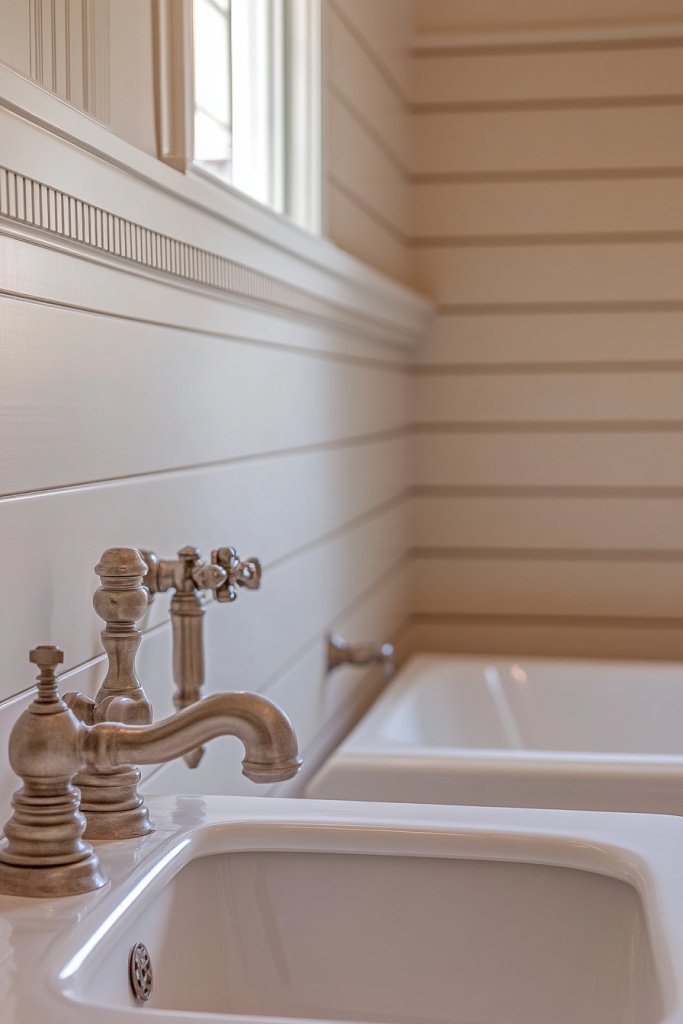 Envision a lower wall section covered in horizontal shiplap, stained or painted in a warm hue. The upper wall remains a smooth, neutral surface, creating a balanced contrast. Vintage-inspired fixtures—like antique brass taps or clawfoot-style hardware—complement the rustic wood. The overall effect is a cozy, nostalgic atmosphere with practical benefits. The textured surface adds tactile interest and durability.
