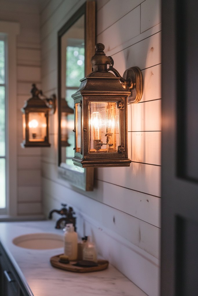 Want to add warm, inviting lighting that complements rustic decor? Vintage lantern-style fixtures paired with shiplap walls create an ambiance full of charm and character. If your bathroom needs a cozy glow, this idea blends function with style effortlessly. It’s a small change that makes a big impact.