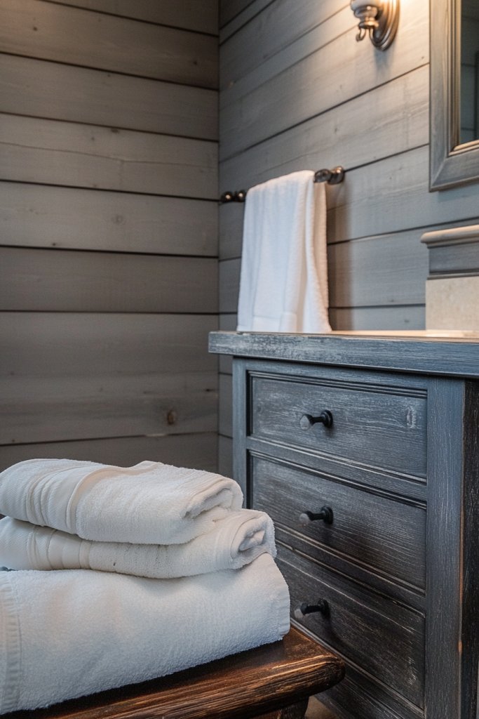Customize by adding vintage-inspired hooks or shelving brackets in matte black or dark bronze. Incorporate plush towels in warm hues like deep rust or creamy beige to contrast with the gray background. Use reclaimed wood accents for storage or decorative elements to reinforce the rustic theme. Small LED candles can add a warm glow, enhancing the cozy vibe without cluttering the space.