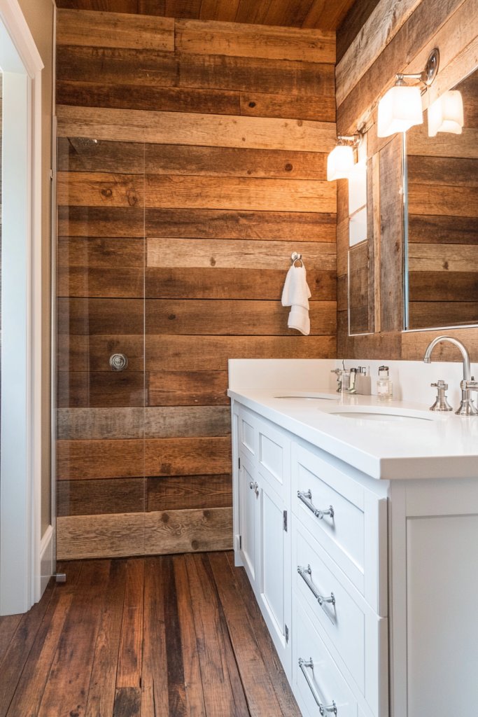 Choose wood with a range of finishes—some raw and rough, others slightly sanded for comfort. You can stain the reclaimed planks in a uniform color or leave them natural for a more eclectic look. Pair with metal or matte black fixtures for contrast, or incorporate woven baskets and textiles for a cozy feel. This style works well in both small spaces and larger master baths.
