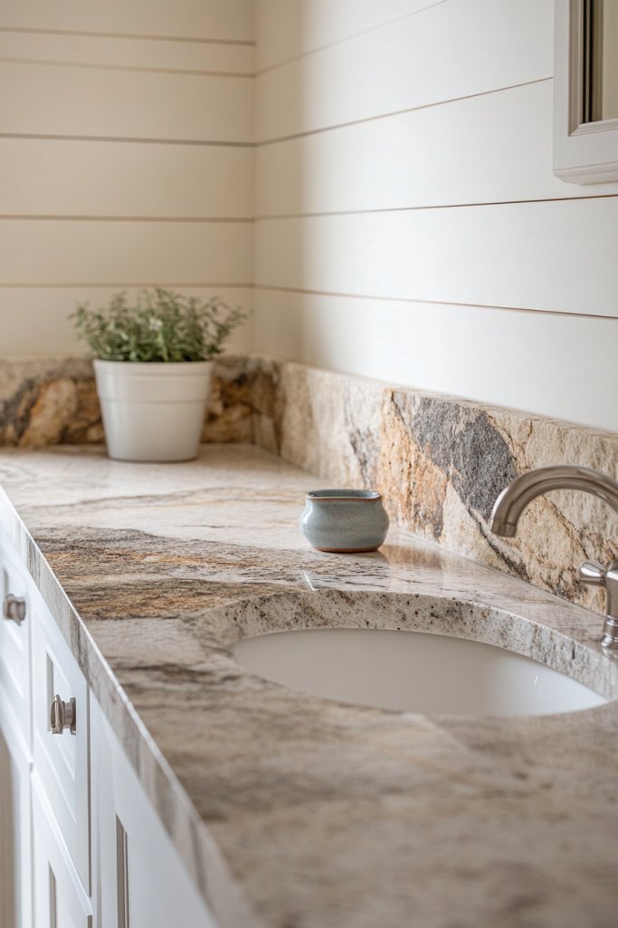 Visualize bright white shiplap walls paired with rugged natural stone floors or accents—perhaps a stone countertop or shower surround. The smooth, clean surface of the shiplap contrasts beautifully with the textured, organic look of stone. This blend creates visual interest and connects indoor comfort with outdoor elements. Soft lighting highlights the textures, making everything feel warm and inviting. It’s like bringing a bit of nature inside.