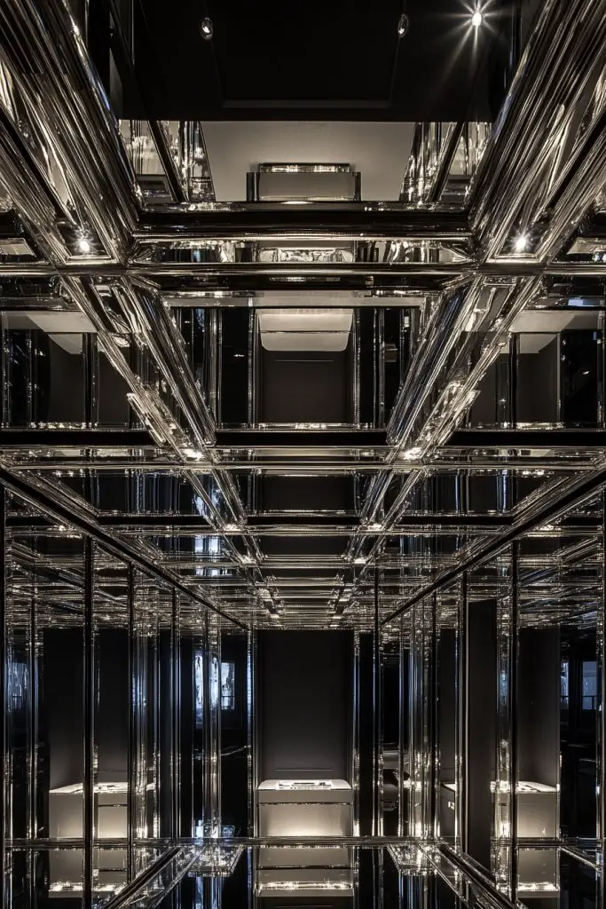 Visualize a ceiling with recessed panels fitted with mirrored surfaces, framed by sleek moldings. The reflections bounce natural and artificial light around the room, instantly brightening the space. The geometric pattern adds structure while the mirrors amplify the room’s dimensions. This design transforms a humble ceiling into a stunning visual feature.