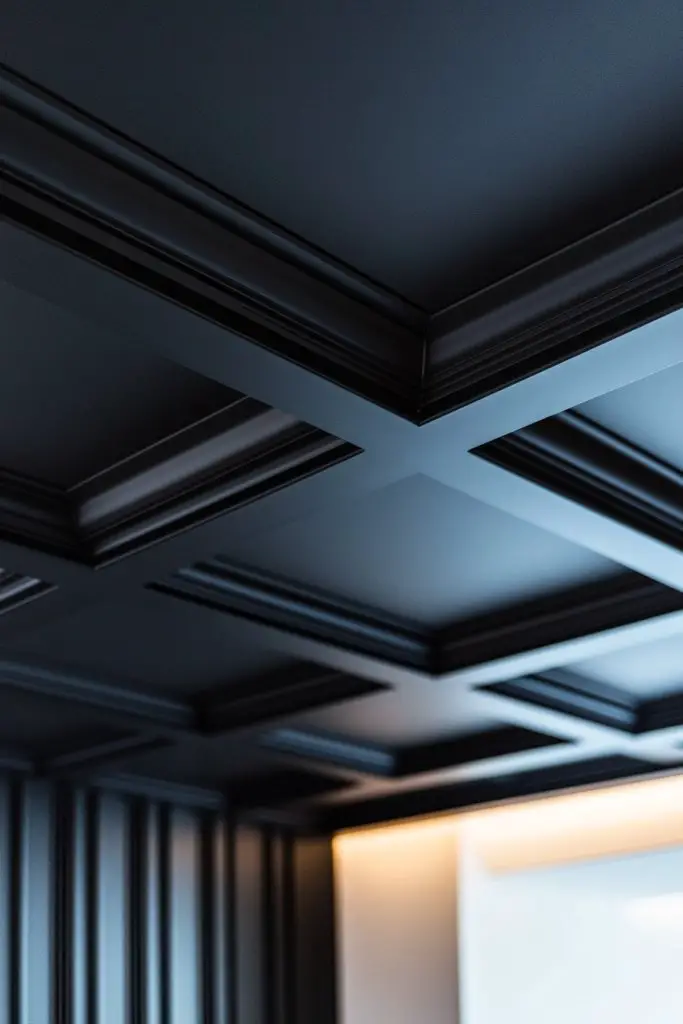 Picture a ceiling painted in a velvety matte black, with precisely framed coffered squares that add depth and dimension. The contrast against crisp white walls makes the ceiling pop, drawing your eye upward effortlessly. Soft ambient lighting highlights the texture and matte finish, giving the space a mysterious yet refined glow. It’s like turning your ceiling into a piece of modern art that complements minimalist decor.