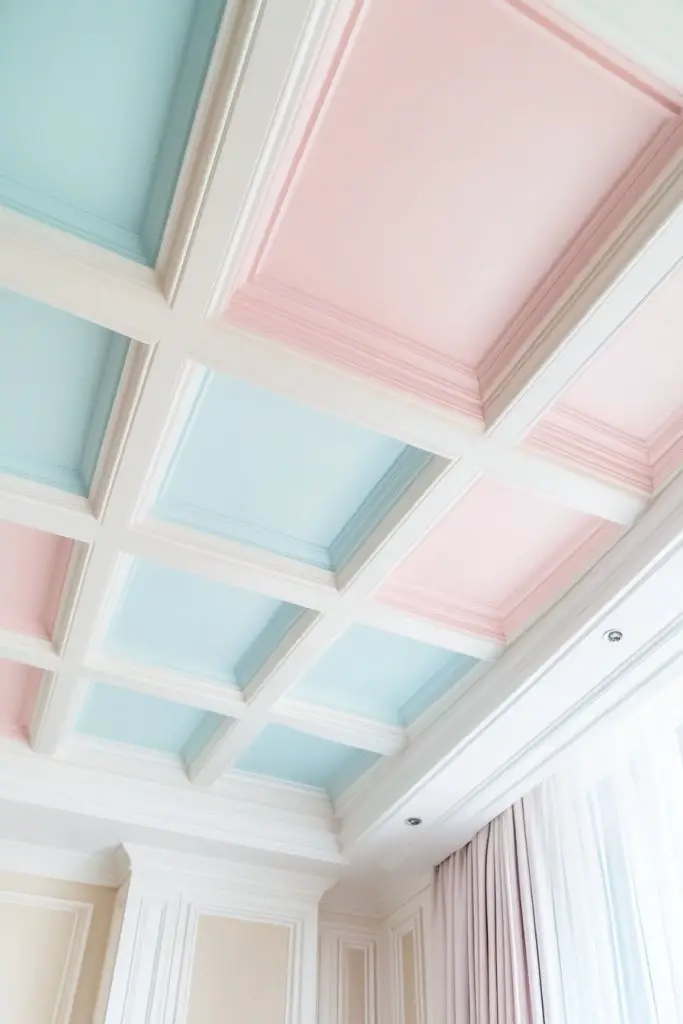Pastel coffers work well in both modern and traditional settings. You can pair them with crisp white walls for a fresh look or with muted neutrals for a more subdued vibe. Seasonal accents like a soft cream throw blanket, light curtains, or floral textiles can adapt the mood without changing the ceiling. For a playful touch, incorporate metallic or matte finishes within the coffers for added depth.
