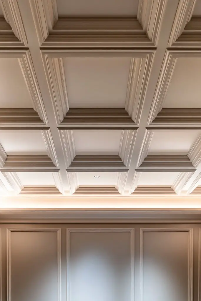 Imagine a pristine white ceiling with perfectly symmetrical square or rectangular coffers, each edged with intricate crown molding. The crisp color enhances natural light, making the room feel brighter and more spacious. The detailed molding adds a touch of craftsmanship, catching the eye with its subtle shadows and highlights. This combination creates a seamless blend of formality and comfort, perfect for dining rooms, living rooms, or home offices.